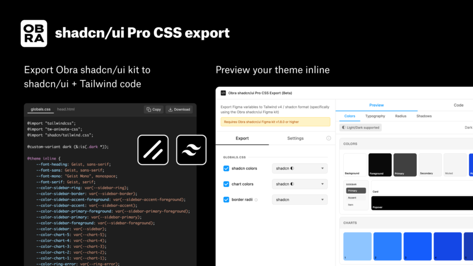 In version 1.8.0, we worked on having much tighter alignment with shadcn/ui and a code export plugin. shadcn/ui relies on theming variables that are intentionally simple, so they are easy to customize.